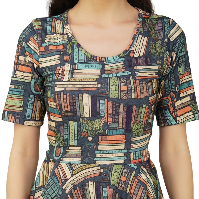 Svaha makes all of my Ms. Frizzle dreams come true. I have several bookish dresses and skirts from this company that I’ve acquired over the years, and I’m impressed by the quality of the clothing and the company’s mission. I always get compliments when I wear my clothing from here, and I always respond gleefully, “It has pockets!” Because they understood the assignment: all of their dresses and skirts have real pockets. They had a 50% off sale recently so I finally snagged this dress, another that I’d been eyeing for a year or two, and this cute little dress for my daughter.