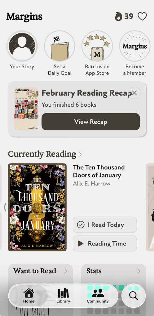 Margins is pretty cute and I think I can handle the flaws. It’s still a relatively new reading tracker, and my curiosity is piqued. I want to see if they’ll age like a fine wine. (That would suit their vibe, I think.) At the very least, I need to stick it out for the rest of this calendar year to get my hands on one of their annual wrap-ups. Will it be worth the wait? Stay tuned, I might or might not report back.